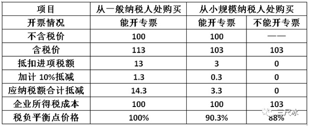 結(jié)論:在能取得增值稅專用發(fā)票的情況下,小規(guī)模納稅人的含稅價(jià)應(yīng)該比一般納稅人便宜3.3元(價(jià)格為一般納稅人價(jià)格的96.9%);價(jià)格高于96.9%,從一般納稅人處購買更合算,反則反之。如果小規(guī)模納稅人不能開專票,小規(guī)模納稅人的含稅價(jià)應(yīng)該比一般納稅人便宜5.85元(價(jià)格為一般納稅人價(jià)格的94.5%);價(jià)格高于94.5%,從一般納稅人處購買更合算,反則反之。